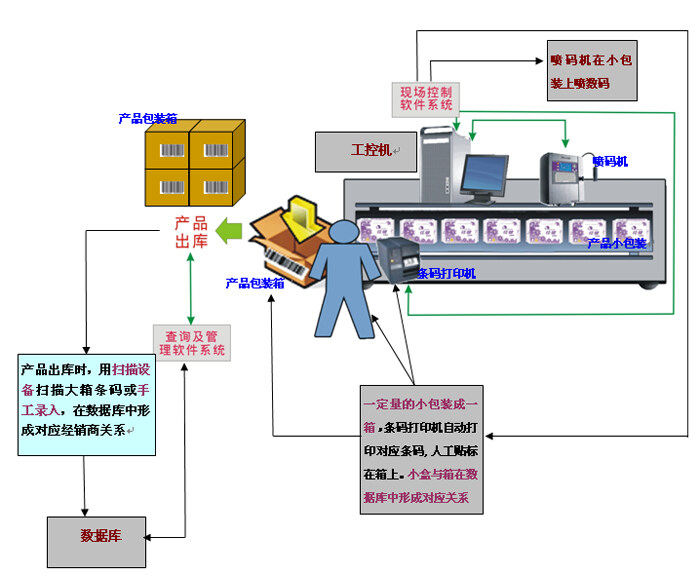 產(chǎn)品的流水線上已經(jīng)將小包裝、大箱上加載數(shù)碼信息,為實(shí)現(xiàn)防偽防竄貨的自動(dòng)化、信息化,并方便公司對(duì)產(chǎn)品物流進(jìn)行及時(shí)、有效、便捷的管理,為貴司提供必要的產(chǎn)品物流信息系統(tǒng)。該系統(tǒng)在客戶端軟件主要是“防偽防竄貨系統(tǒng)”。在流水線上掃描小包裝和外箱上面的條碼,并使之形成對(duì)應(yīng)關(guān)系,把數(shù)據(jù)上傳到系統(tǒng)里,以便以后的管理和查詢。